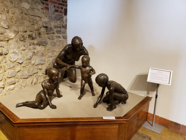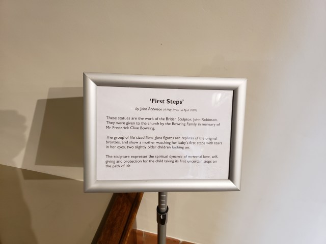Statues of a family watching their youngest take their first steps (as explained in the sign below). This is near the entrance to the lower levels of the church.
