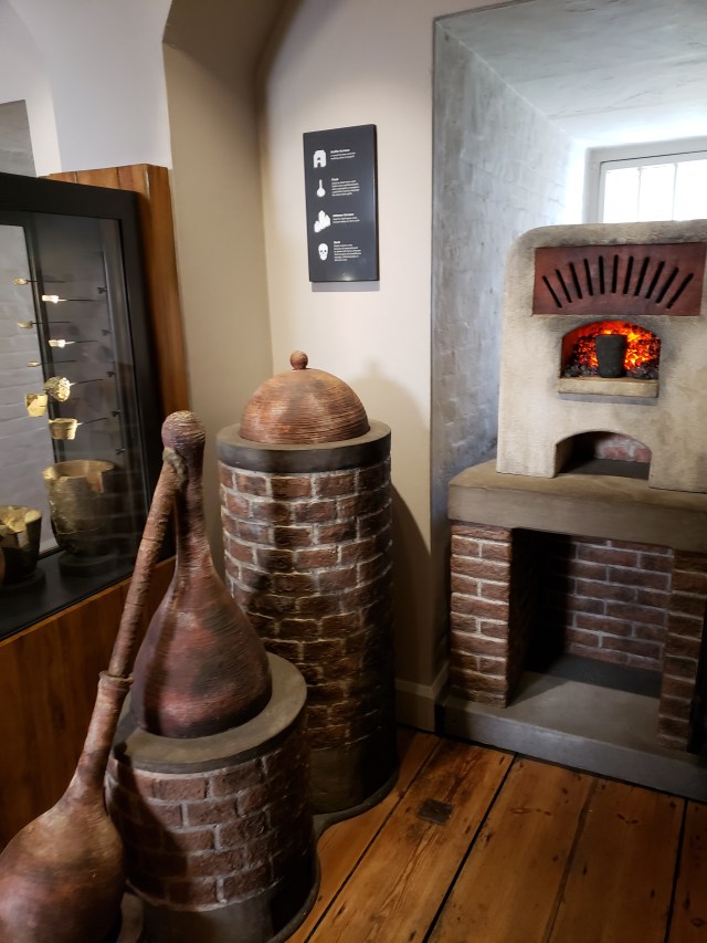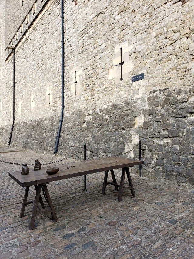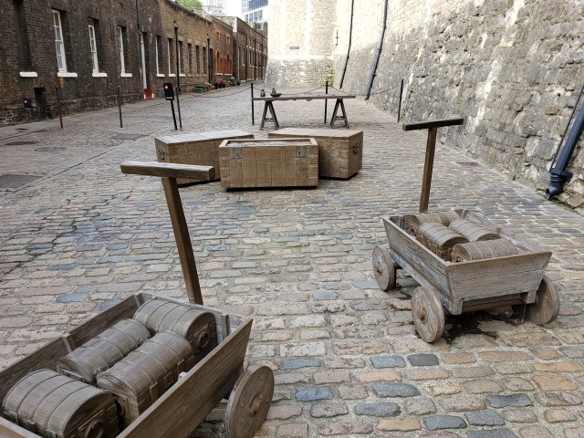 The Royal Mint was once housed at the Tower of London. Now there is a museum in it’s place. It was interesting to know how people shaved the coins to get the silver… the Jews were blamed and persecuted for it. Also the coins were rarely replaced though some monarchs made a point of updating them and the mint was used for this purpose.There was also a display showing how a king from another nation (sorry, I forget which one) simply had his image stamped into the center of other nation’s coins to use them as his own and thus not have the expense of minting his own…. clever….Table set up outside the mint showing ‘newly minted coins’ being bagged…More of the display outside the mint with crates of ‘coins’ and wagons with small ‘trunks’ that presumably contain more coins.Some examples of devices used to melt the silver for the coins.Weighing the coins… the weight of the coins had better match the weight of the silver provided to make them or the minter would face dire consequences.