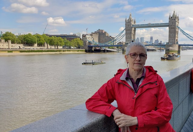 Barbara with the Tower Bridge behind her and the Tower of London across the river Thames.