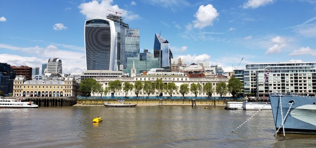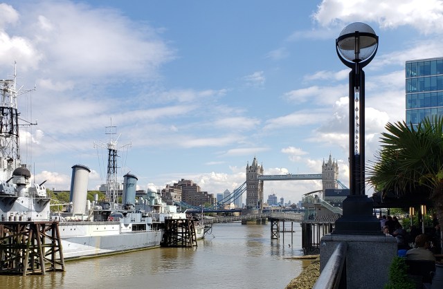 There is quite a contrast between the new (and many oddly shaped) buildings and the buildings from times of old. The bow of the boat in the river is the HMS Belfast that is open for tours.
