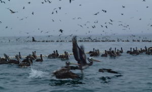 These pelicans and hundreds of other birds were swarming a fishing boat when our tour was headed outta the Federal marine reserve at Ballestras Islands of Paracas. Our captain took us over for a quick look. The smaller birds dive straight into the water then seem to just bounce right out of the water, give a little shake and off they fly…usually with a small fish in their mouths.