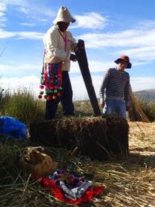 The president, standing on top of the miniature island, and our guide showed us how the Island was made. First they cut blocks of the reeds with their roots…originally this was done by driving sticks into the soil around the roots. Now they have big saws. These blocks are attached to each other and the reeds are cut to lay as a bed over them. Several layers of reeds are placed in a cross cross pattern on top. Then houses are built using the reeds. Flat stones are placed where the cook stoves – pottery stoves – are to be placed since the dry reeds are flammable and, indeed, provide the fuel for the fires under the stoves. This is hard work and it never really ends because the reeds that make up the floor of he island have to be replaced every 15 days!