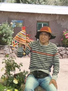Taquille Island has some interesting traditions. The hats are just one . The hat our guide is showing in this picture is the hat prepared for a new infant. It is multicolored to show how happy the family is to have a new addition.