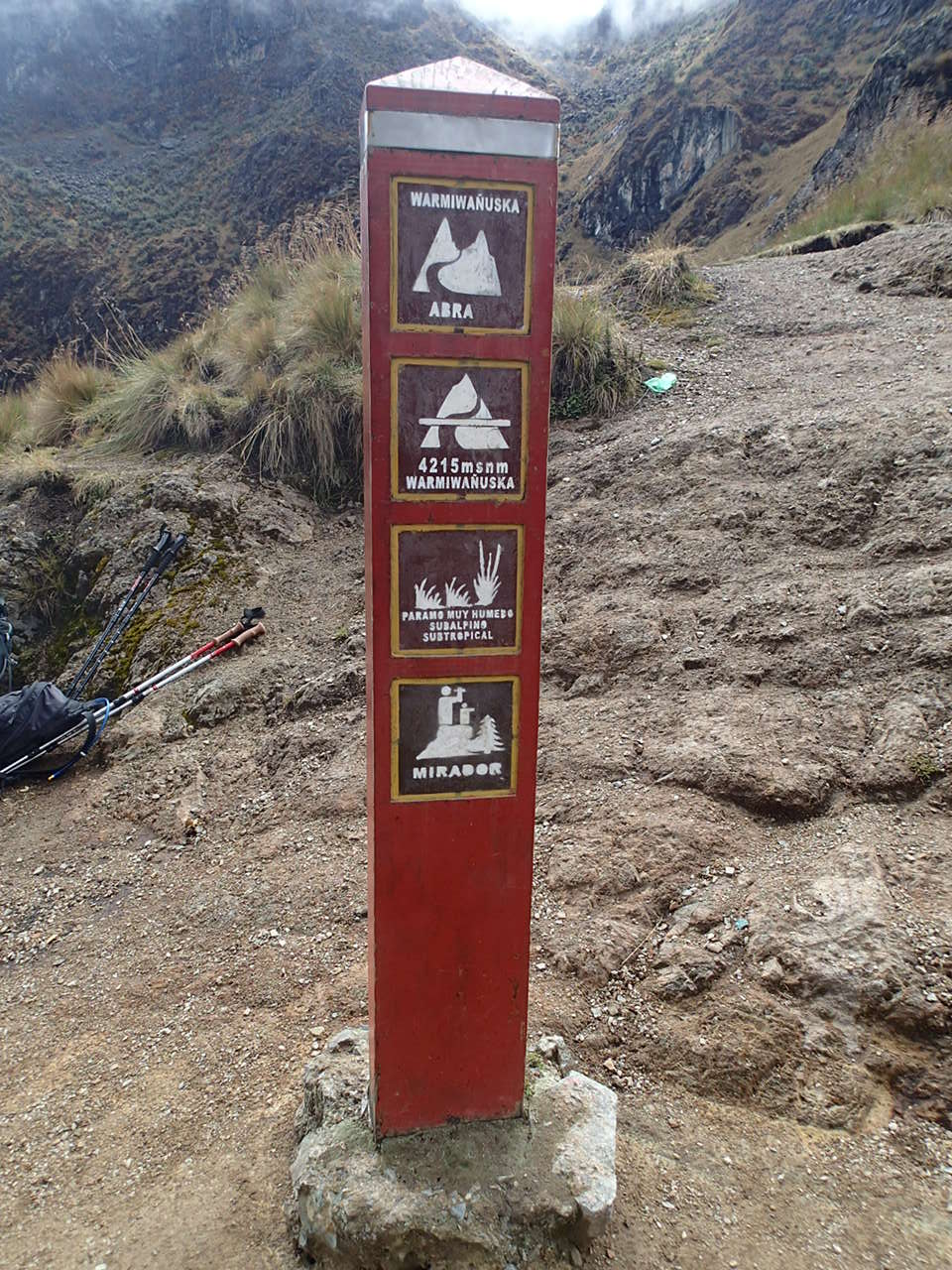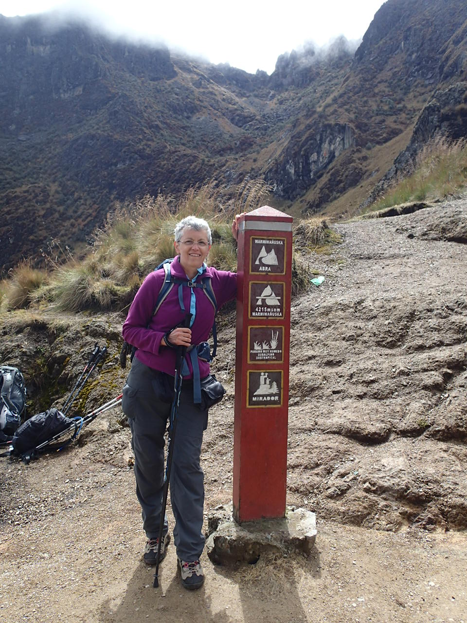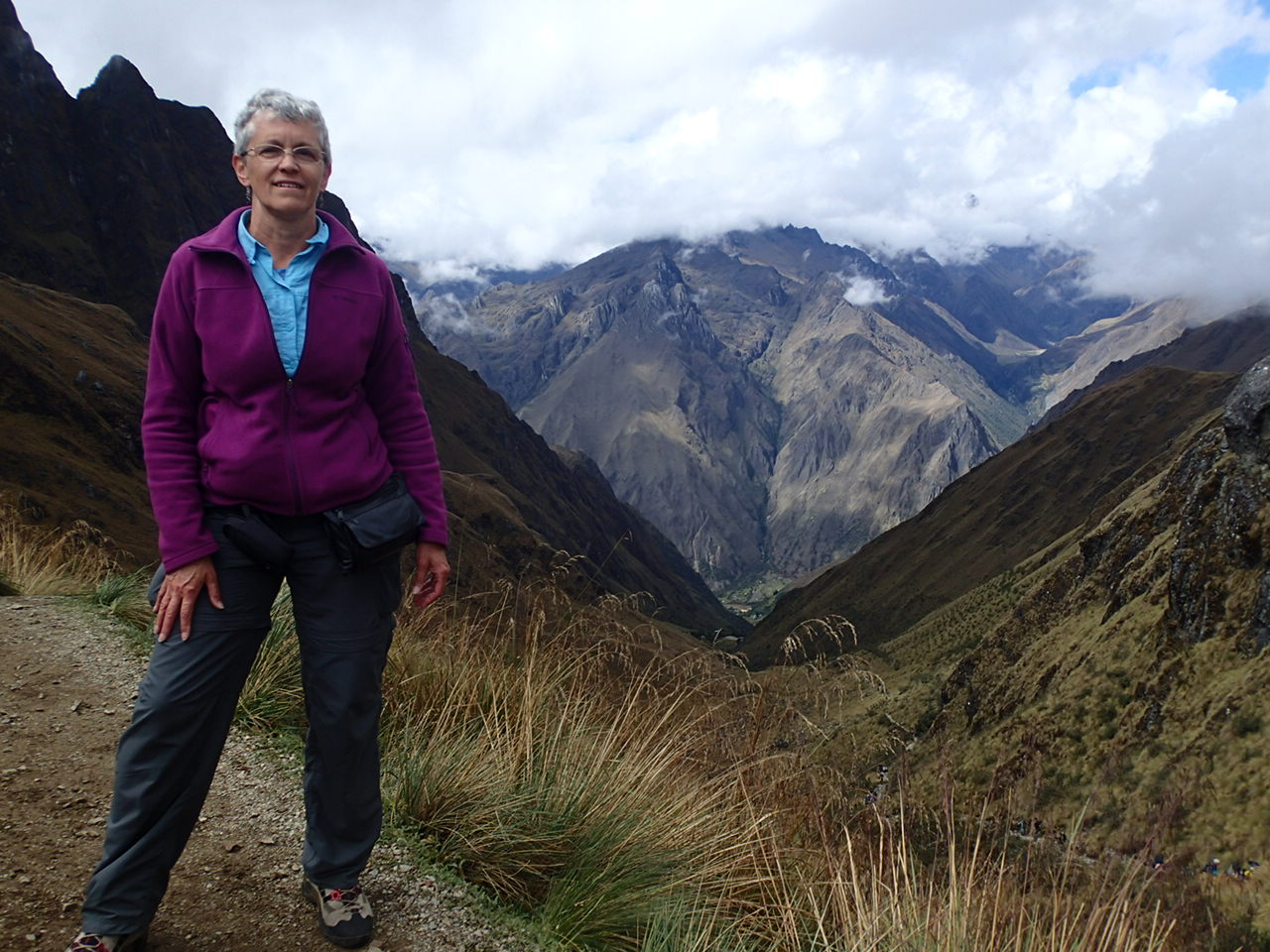 At the top of Dead Woman’s Pass – a lowly 13,776 feet above sea level. the last picture is looking back at the pass – can you see the profile of the woman lying down? This profile is where the pass got it’s name not from a woman dying on the pass!! In fact, it’s other name is Sacred Woman’s Pass – I like that better….. This was the only section I wore my hiking boots for….going up was OK, but as we started down the other side of Dead Woman’s Pass, they started to hurt my feet. I had only worn them because my five fingers were still wet in the morning. After I put my five fingers back on, no more foot problems so I gave my boots to a porter – just hope they work better for him!