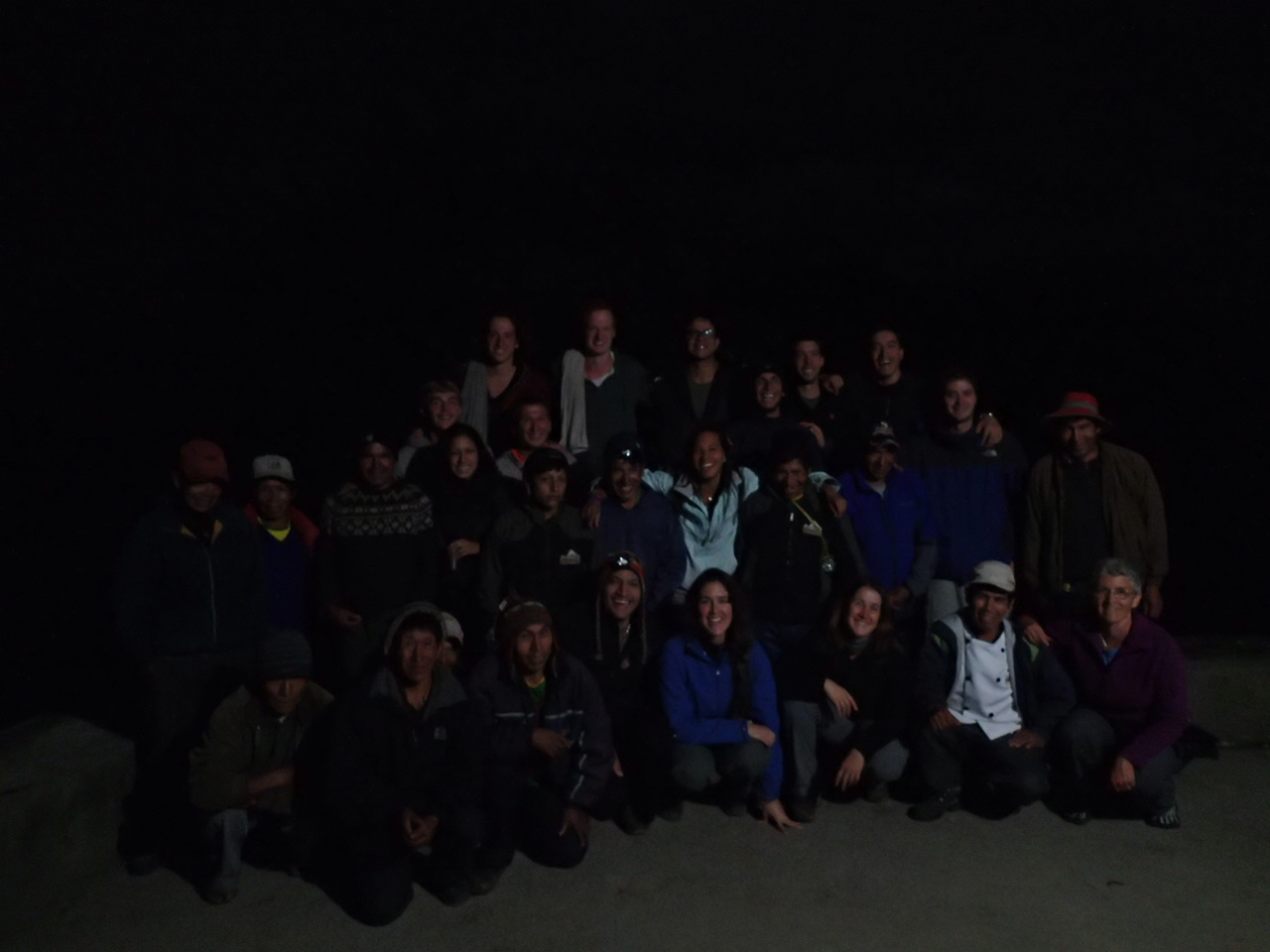 This turned out dark because my flash did not work, but this is the whole group with porters. The only ones missing are our guides, Ramiro and Willy who were taking the pictures. This was taken when we honored our porters on the last night on the trail. The youngest was Mario, our waiter during our meals, who was 19 and the oldest was 51!