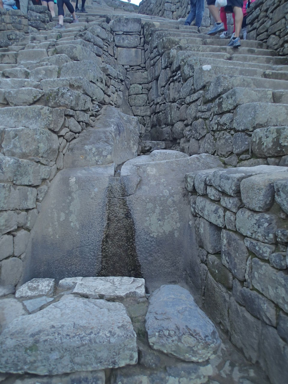 MacchuPicchu is build on a mountainside – more stairs – more stairs – more stairs – oh, and did I mention, more stairs! I kind of chuckled when I heard the day visitors complaining….what do they know about stairs??? The place was crowded and it was hard to get pictures without people or their shadows in them. 2500 people visit MachuPicchu on a daily basis! This picture shows part of the stairway of fountains – the stairway is split with fountains between the 2 sets of stairs.