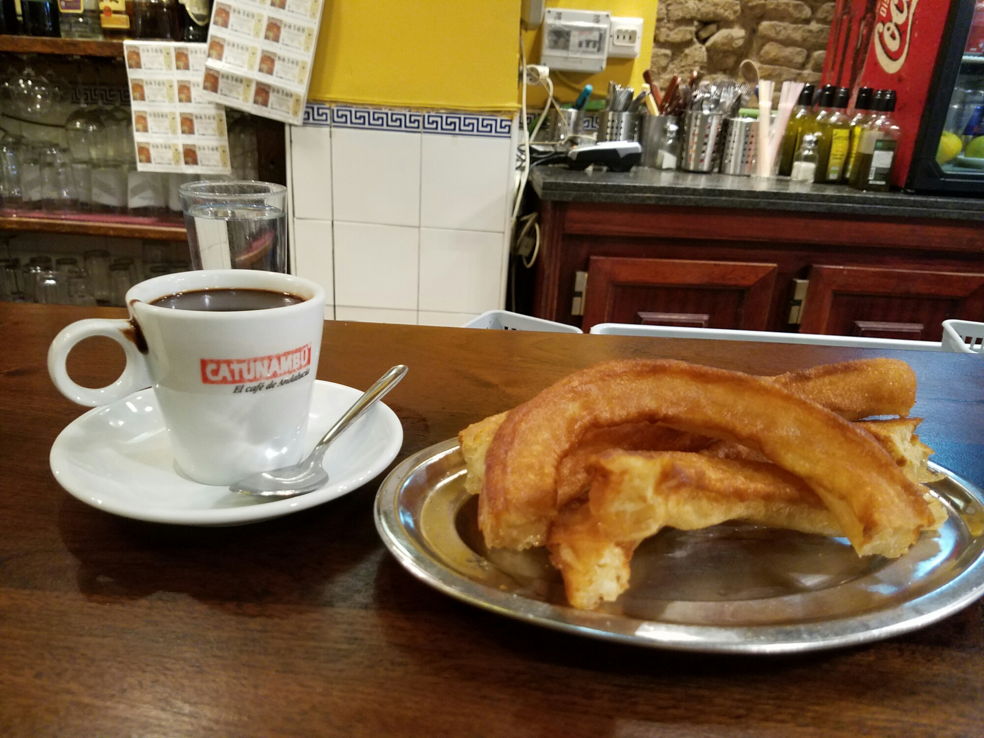 Hot chocolate so richly that they gave me a glass of water with it and Spanish churros to dip in the chocolate.