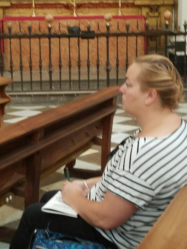 This gal was sitting in the Cathedral drawing without looking at the paper and it looked like she was doing a great job, but she covered it up when she realized that I was peeking.