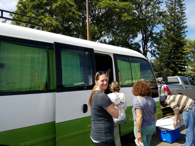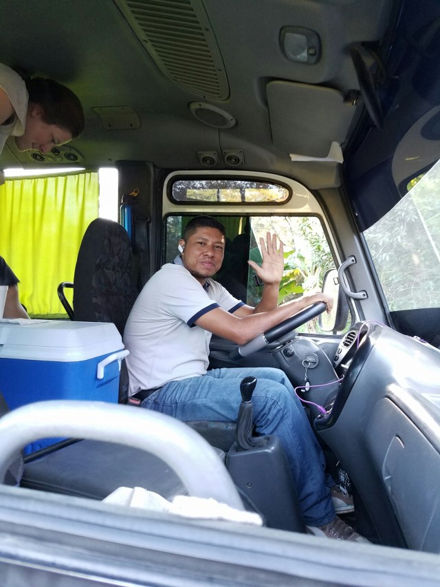 This is our driver for the trip to La Florida and back out. He took it very slow and careful over the very rough roads probably because he owns the bus company and those roads could have destroyed the bus….I didn’t get good pictures of the road on the way in, but they had been almost washed away in places by the rains and there were deep troughs cut in them by the rushing water. I do have pictures of the road on the way out as we traveled during the day…..left late …. on Jennifer Time…, but still in the morning.
